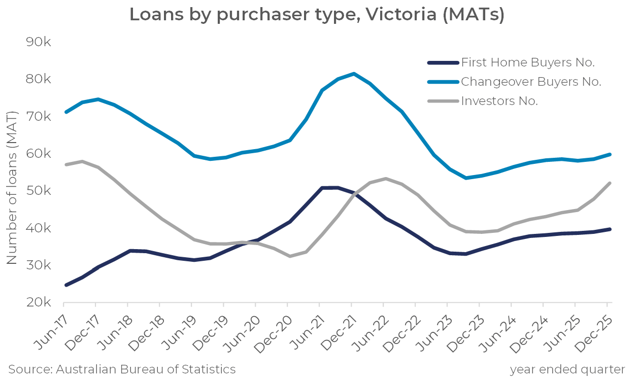 Investor activity in land and new housing has increased significantly since 2020, up by nearly 60% since 2020. Investors now make up 47% of all loans for new housing construction, reinforcing this shift toward outer-suburban rental supply.