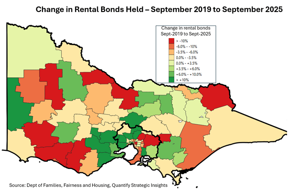 The stagnation and recent decline in rental bonds across Victoria, combined with a clear redistribution of rental stock toward growth corridors and select regional areas, reflects a structural tightening in rental supply.